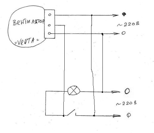 Тогда подключаем так: ноли соединяем, фазу вентилятора берем на входе выключателя, управляющий сигнал на вентилятор берем на выходе выключателя.