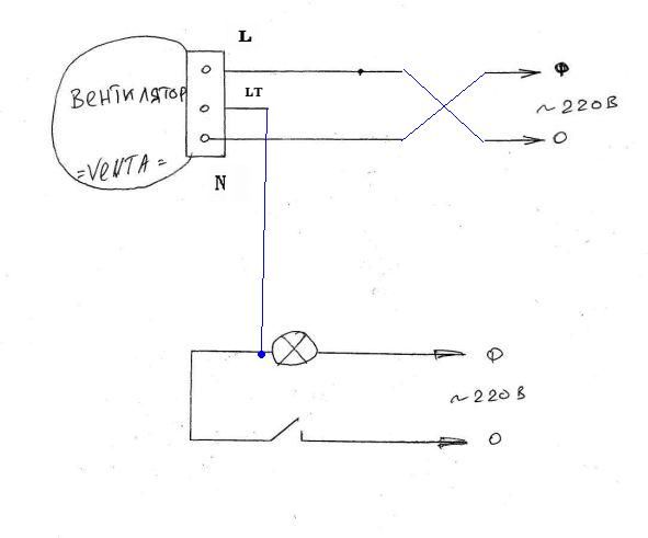 Во-первых, три клемки на вентиляторе обзываются: L, LT, N. Что это означает, не знаю, но подозреваю, что менять местами фазу и ноль - как минимум стремно.