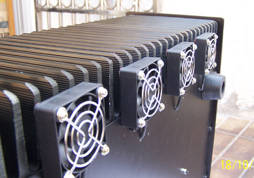 Цена комплектующих не даст сделать дешевле. Выглядит весьма кустарно. Система вентиляции улыбнула (там где 8 маленьких вентиляторов снизу по ребрам радиатора, шурупами прикрученные к воздуху)