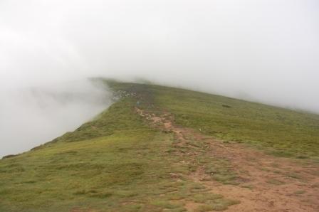 На вершине было реально холодно, думаю, что пару градусов всего, так как лежал снег, правда мало и мокрый. Облака или туман, были на всем пути к вершине, вперед 20м и назад 20м и сама тропа. Все. Только на обратном пути стало немного рассеиваться.