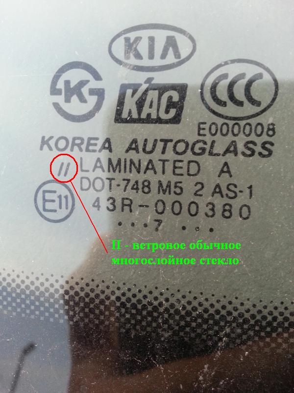 5. Тип стекла: I - упрочненное ветровое стекло II - ветровое обычное многослойное стекло III - ветровое обработанное многослойное стекло IV - стекло из пластика V - прочие (не ветровые) стекла с коэффициентом пропускания света ниже 70% V-VI - двойное стекло с коэффициентом пропускания света ниже 70% Отсутствие индекса - стекла не являющиеся ветровыми коэффициентом пропускания света не ниже 70%