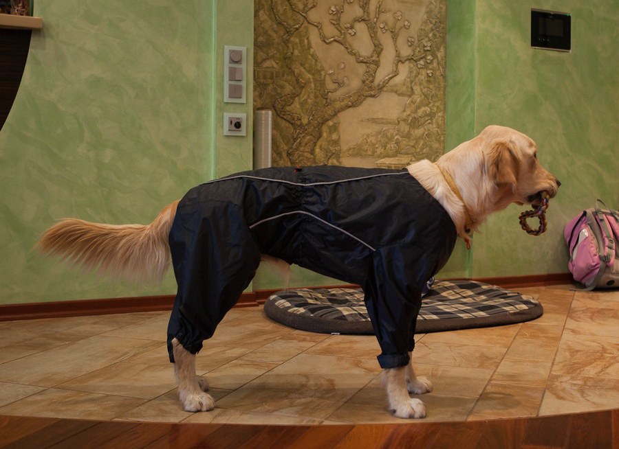 У собаки есть дождевик классный, защищает от дождя и грязи отлично. Но поизносился уже капитально. В инет-магазинах нужный размер не нахожу (всё на маленьких шьют). Может, у кого-то есть контакты портного для животных?