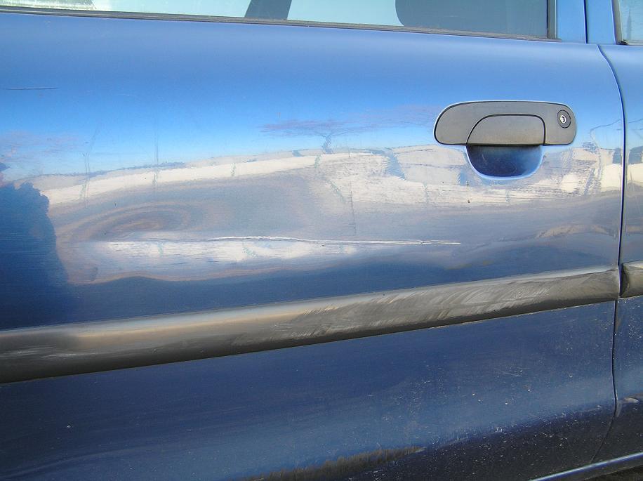 Доречі, по фотці, яку я зараз викладаю, видно, що він повернув колесо в мою сторону і пропахав резиною мою накладку. Була би більша вмятина на двері, якби не брус, який знаходиться якраз на рівні прастикової накладки. Вмятина, яку видно, знаходиться вище бруса безпеки.