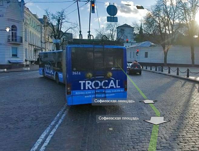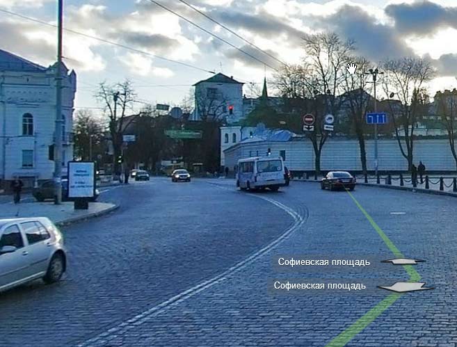 Над левой полосой висит кирпич. Но с нее поворот налево разрешен и на самой ул. Софиевской запрещающих знаков нет. Можно ехать? И как?