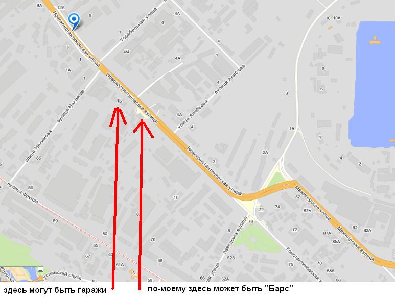 Короче, на Новоконстантиновской, где-то напротив №2-а есть заправка "Барс" и там белые гаражи. Ткните по карте и как лучше туда ехать от "Фрунзе" чтобы не разворачиваться. Бо того района вообще не знаю. Спасибо.