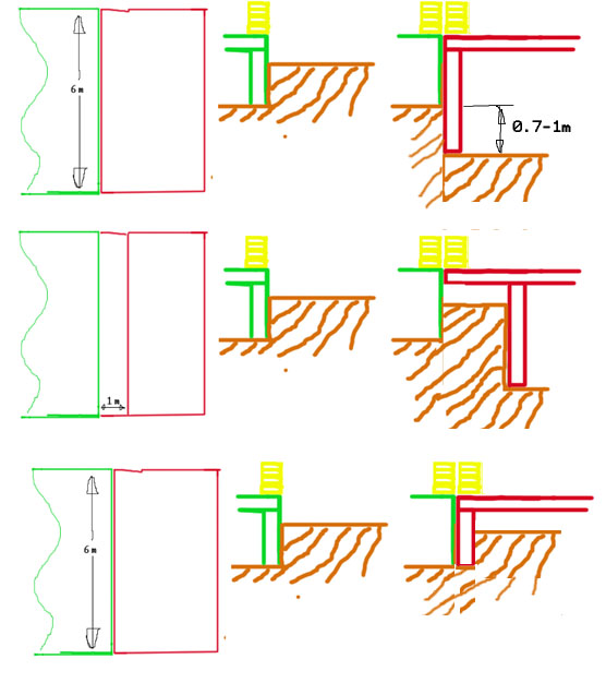 Ага, немного разобрался. Новый фундамент как бы ступеньками идет. Ниже постарался изобразить что я хочу. Там три рисунка. Сверху это как я себе это изначально вижу. Средний - если отступить на метр от существующего, как я понял, это более безопасно. Нижний - это если подвал не делать, просто залить ленту под пристройку. Но опять же впритык к существующему.
