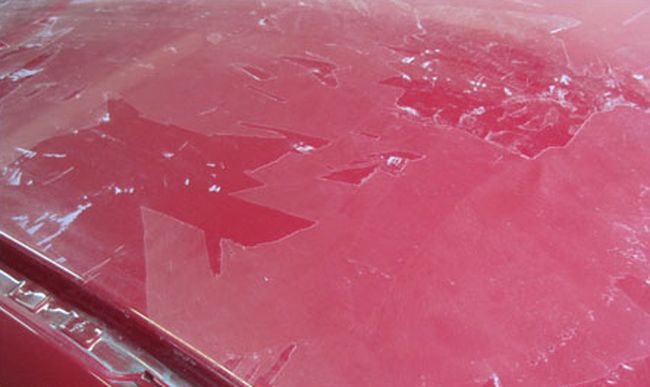 Уважаемые друзья и любители тюнинга. Уже давно известен такой вид тюнинга, как покрытие автомобиля винилом или пленкой. Глянцевой пленкой, матовой пленкой, пленкой под карбон или защитной пленкой. Речь пойдет о том, что происходит с лако-красочным покрытием при снятии пленки. Вот таким автомобильчик был с винилом, который, кстати, приходилось постоянно где-то подклеивать. Далее хозяйка решила снять винил. Мы делали это максимально аккуратно, нагревая и используя профессиональные средства для снятия пленки. В некоторых местах пленка снялась без последствий. Но на горизонтальных поверхностях, таких как капот и крыша начались неприятности. Винил за время эксплуатации сильно нагревался на солнце и клей на пленке просто въелся в краску. При отклеивании пленка снималась прямо с лаком: Винил не рекомендуют клеить на недавно окрашенные поверхности. Кстати, данная машина была куплена новой и крыша на ней не перекрашивалась. Далее мы обратили внимание на то, что при отклеивании пленки, если на лако-красочном покрытии были сколы, то лак снимается прямо от скола: Но это еще пол-беды. Шаблонов на все машины не существует и стыки двух пленок просто отрезают острым канцелярским ножом. При разрезе пленки в лучшем случае страдает лак. На фотографии ниже видно, что лак снялся прямо по линии разреза, во время отклеивания желтой полосы.
