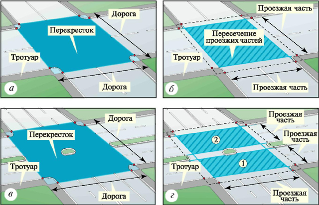 Читай до посинения или пока не поймёшь отличие пересечения проезжих частей от перекрестка.