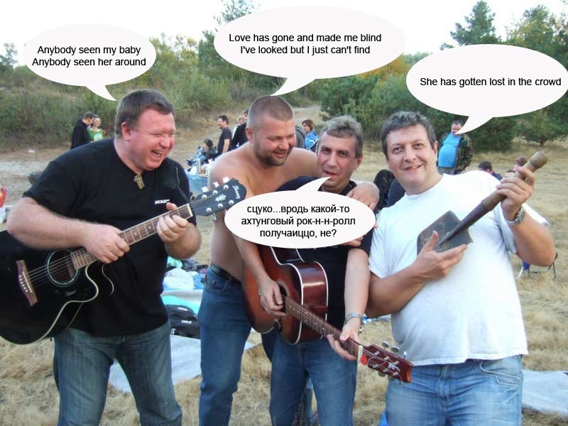 а зараз, дорогі друзі, перед вами виступить группа "Rolling stones", що по нашому значить "Котилися каменюки". Вони виконають пісню " Anybody seen my baby?" , що по нашому значить "А ніхто не бачив мою бабу?"