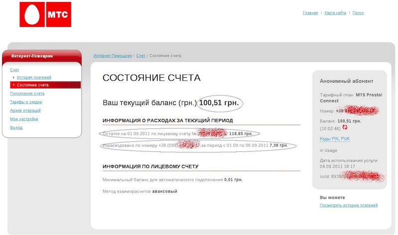 Проработав некоторое, довольно большое время, в очень мобильной компании МТС, но как считать балансы так и не понял, вот интересный пример. Пакет "Простой коннект без абонплаты", и так сумма на счету на данный момент 100,51. Сумма на начало месяца 118.85, за период с 01.09.2011 по 06.09.2011 израсходовано 7.38, теперь кто назовет правильный ответ почему 118.85 - 7.38 = 100.51 тому пирожок на полке. Ну и картинка как пример, что все циферки правильные.. кстати 10 грв это по 9 копеек почитай >100 метров трафика, как обычно где-то потерялось...