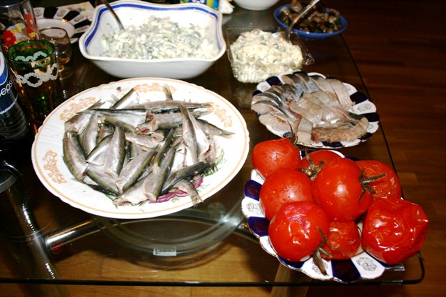 Новый год решили встретить на квартире, во главу стола поставив одно из самых неподражаемых одесских лакомств ( наша версия) - купленную на Привозе свежайшую малосодльненькую тюльку-сарделю и вкуснейшую селёдочку, какой в Киеве не сыскать... ну и ромом (грех в портовом городе кушать что то другое).Остальное к столу добрали в рядом стоящем на Греческой пл. ТЦ Афина (вроде), где имеет место в цокольном этаже супермаркет с приличным выбором продуктов и кулинарии