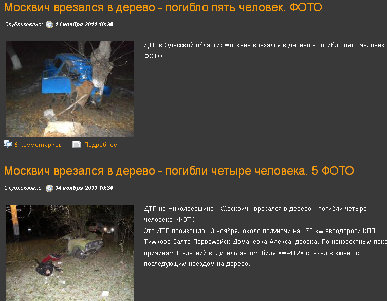 по данным МВД, в ночь с 12 на 13 ноября около 00:05 на автодороге Тимково - Балта - Первомайск - Доманевка - Александровка, недалеко от пгт Доманевка, водитель автомобиля Москвич-412 не справился с управлением, съехал в кювет и врезался в дерево, после чего скрылся с места происшествия.