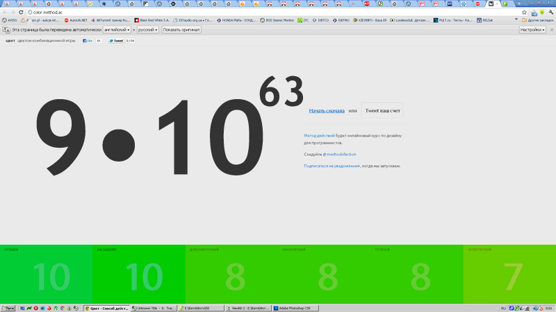 Да ну на фиг...Еще и на время...Вот более прикольный на цветовосприятие без гонок... http://www.xrite.com/custom_page.aspx?PageID=77 Выставить по порядку квадраты от одного цвета к другому,чем ниже результат тем лучше...У мну 4