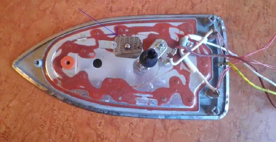 Вобщем имеется утюг. Вполне современный утюг, купленный году так в 2007. На днях по необьяснимым причинам он отказалася работать. Поскольку ТС было нефиг делать, он решил этот самый утюг разобрать с целью отремонтировать. После разбирания утюга на мелкие части было обнаружено вот то неподобство что изображено на картинке снизу. Поскольку ТС знает что такое тестер обыкновенный (выполненной в виде отвертки из прозрачной желтой пластмассы) и даже немного умеет им пользоватся, он повключал утюг в розетку и с по мощью тестера обнаружил что электроэнергия в утюг входит, а обратно не выходит. И причина сей несуразности находится где-то в белом проводе, ибо электричество до него доходит с обоих концов, а через него пройти не может. На том белом проводе красным кружочком обведен некий твердый девайс, который спрятан под елым куском изоляции и прикруче к корпусу утюга шурупом. Собственно ТС теперь терзают смутные сомнения что причина неработоспособности утюга находится таки в той фиговинке что прикручена шурупчиком и ему дюже интересно узнать что ж то за фиговинка? Есть догадка что то какая-то фигня связанная со стабилизацией напряжения, и что если ее там не будет, то утюг будет работать как раньше. И посему ее можно благополучно оттуда выдрать и заменить на равнозначный куско проволоки. Прав ли я? ЗЫ: также интересно узнать что-то за штукенция на которую указывает синяя стрелка? это не тот ли девайс который выключает утюг по мере его нагрева?