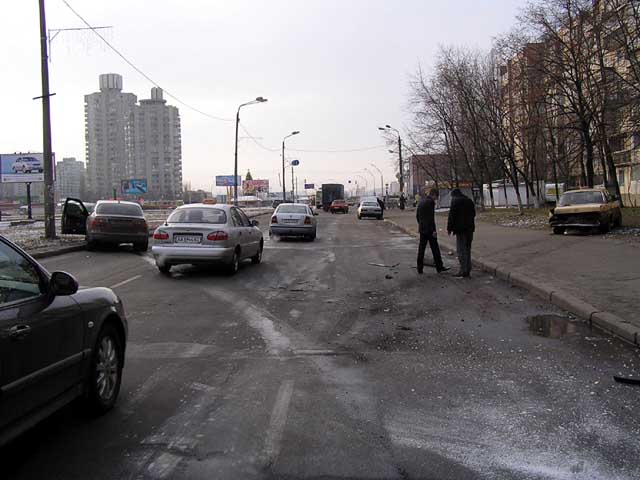 Буквально свежак - в 9:00 случилось. Я как-бы свидетель Вобщем выезжаю из двора, пропускаю мерседес, а потом жду пока проедет кто-то кто едет прямо посередине дороги. Чертыхаюсь - выезжать не могу, все-таки он не по второй полосе проезжает. Пропускаю, этот второй - какая-то свежая альфа-ромео, как я понимаю, постепенно все-таки перемещается левее, потом так же плавно начинает ехать вправо и набирать скорость. Влетает в яму-лужу около бровки, его отбрасывает правее и лупит медленно едущий по крайне-правой полосе мерс-такси. Мерседес подскакивает и вылетает на тротуар, виновник же отлетает к левой обочине и замирает. К счастью мерс не задел пешехода и пролетел буквально в трех метрах от спешащей на работу барышни. Вобщем таксист в норме, только беспокоился что на заказ не может доехать, перезвонил своему заказчику с моего телефона. За те пять минут что я простоял там дозвониться мне никуда не удалось (ГАИ). Водитель-виновник - молодой парень в костюмчике и ооочень заторможенный. Глаза краснючие щелочки, ходит как-то неуверенно и медленно. Хотя перегара я не почуствовал. Обглатался чего-то? Пытался пробуравить что его подрезал кто-то и звонил каким-то своим папикам. Вобщем я оставил визитку таксисту, сделал пару фоток и поехал на работу не дожидаясь развязки. Вот такие утренние дела.