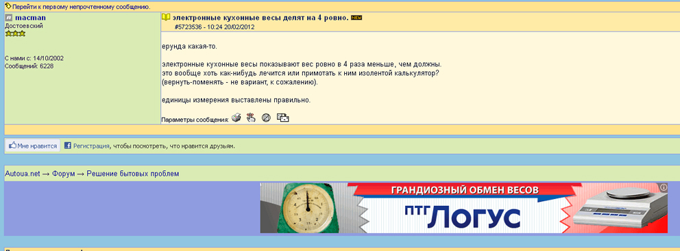 Maksimus 20.02.2012 13:58 пишет: ровно в 4 раза? а то мог в режим фунтов (lb) СыСыА преключить - там правда не ровно, но близко: 1 фунт - 453гр. не, не так. 200грамовая пачка масла на моих весах показывает 50 грамм. етм. весы куплены пару месяцев назад, чеки съедены, блжад. батарейки вынимал-вставлял