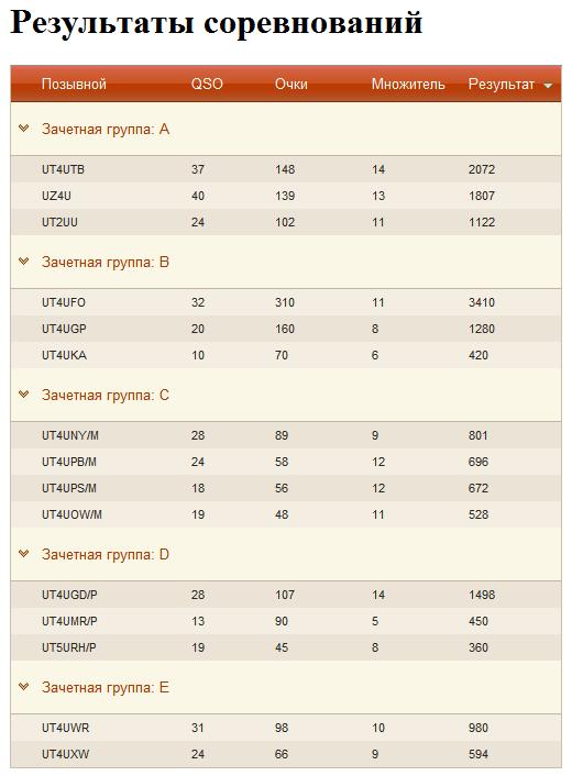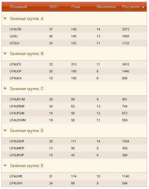 Поздравляем победителей в категориях! Стационар\Анлимитед - UT4UTB , с первой победой Слава! Загородные станции - UT4UFO (с опытом не поспоришь, результат поражает - МОЛОДЕЦ!) Мобильные станции - UT4UNY/M , победа вырванная в тяжелой борьбе в самой многочисленной категории - ПОЗДРАВЛЯЮ! Портативки - UT4UGD/P , с отрывом более чем в 2 раза от ближайших конкурентов. Так держать! Коллективные станции - UT4UWR , особенно приятно поздравить участников этой категории!