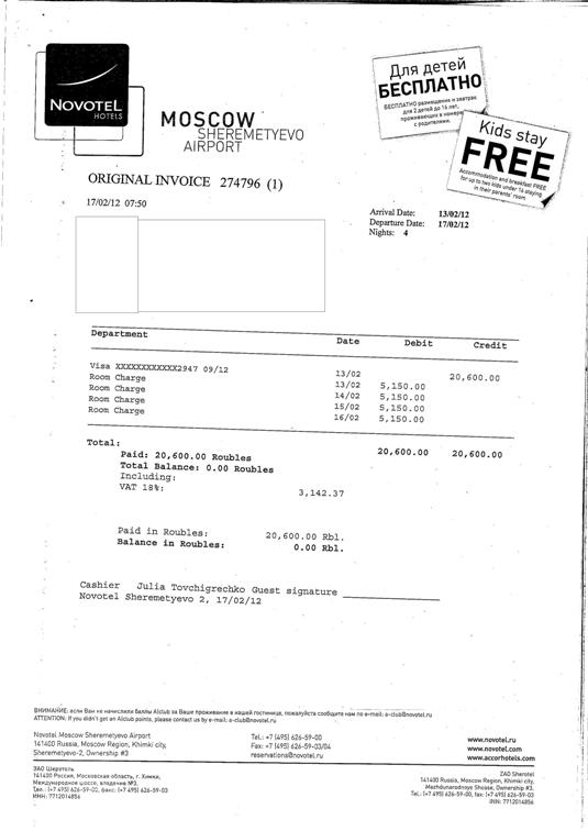 и помни, на счете за гостиницу должно быть написано original invoice или invoice но никак не information copy или copy invoice - у меня каждый 5-й с такими приезжает, а компенсировать затраты можно только по оригиналам.