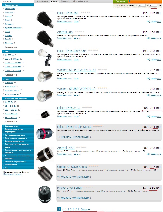 тут на форумах, внизу "студийниє вспишкі от 145 грн". подивлюсь, що там за пиха може бути за 145 нрн. відкрив - перелік без сортування, ціни позицій 300, 2000, 1300... перемішано. добре, пишу у фільтр "від 145 до 250" видає знову перемішано і ціни більше 250 тисну на "ціна", щоб посортувати за ціню - вилазить вікно з якоюсь помилкою. закриваю, тисну знову - отримую сортування, як на малюнку. тільки знову відібрались доржчі 250, купа сторінок. Щось десь якось не коректно працює там відбір по діапазону та сортування.