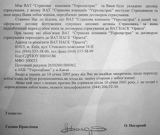 НАСК "Оранта" и Укрсоцстрах действительно объединяются, следствием чего будет закрытие Укрсоцстраха в нынешнем виде. Все активы и обязательства Укрсоцстраха переходят на Оранту, вот почему по Вашему договору страхования ответственность будет нести "Оранта". Разрывать договор не нужно, поскольку: 1) машина у Вас кредитная, скорей всего прокредитована Укрсоцбанком, соответственно смену страховщика нужно согласовывать с банком, который Вам порекомендует ту же Оранту; 2) даже если машина не была б кредитной, разрывать договор страхования только потому, что обязательства по договору страхования переходят на другую страховую. Оранта на сегодняшний день уж точно не хуже, чем был Укрсоцстрах.
