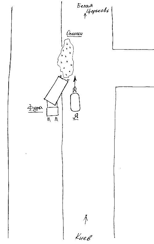 Схему ДТП я прилаттачил в файле. Отвечу на вопросы, но два слова комментариев. Фура выезжала справа со второстепенной и остановилась на встречной (или притормозила), якобы для того, чтобы пропустить транспорт в сторону Киева. Осколки большей частью, но не все оказались за пределами полосы, то есть, отлетели от моей машины влево (а куда им еще лететь было, те, что летели вправо - остались в машине). Но осколков часть таки была в пределах моей полосы движения).