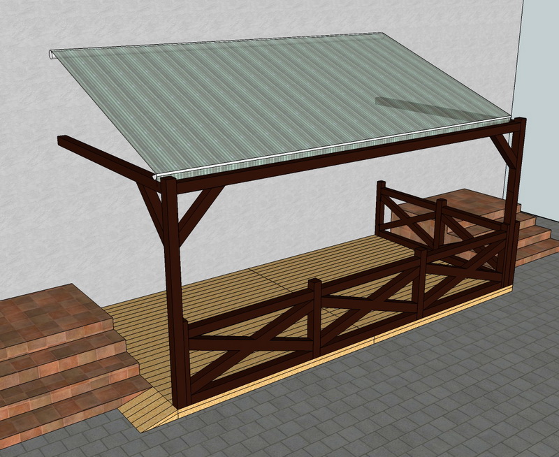 Принцип понятен. Если "крыша" тканевая, то подпорок не потребуется, если капитальная, то несущая балка или толстющая будет или потребуются подпорки. Ну и пол, его будет дождем поливать, снегом заносить. Если делать на долго и по уму, будет дорогой, лиственница или что-то подобное + пропитки и т.д. Себе на даче сделал что-то подобное, поэтому в ньюансы вникал. Но так как это дача, то делал из сосны с мыслью проще поменять, когда сгниет.