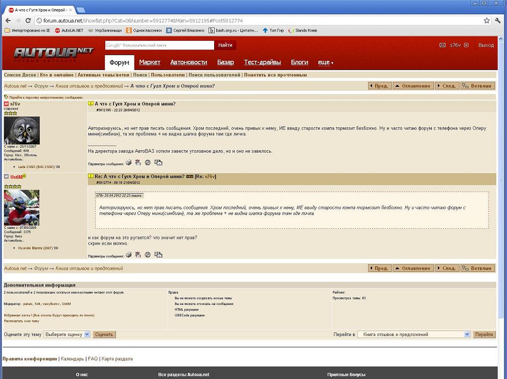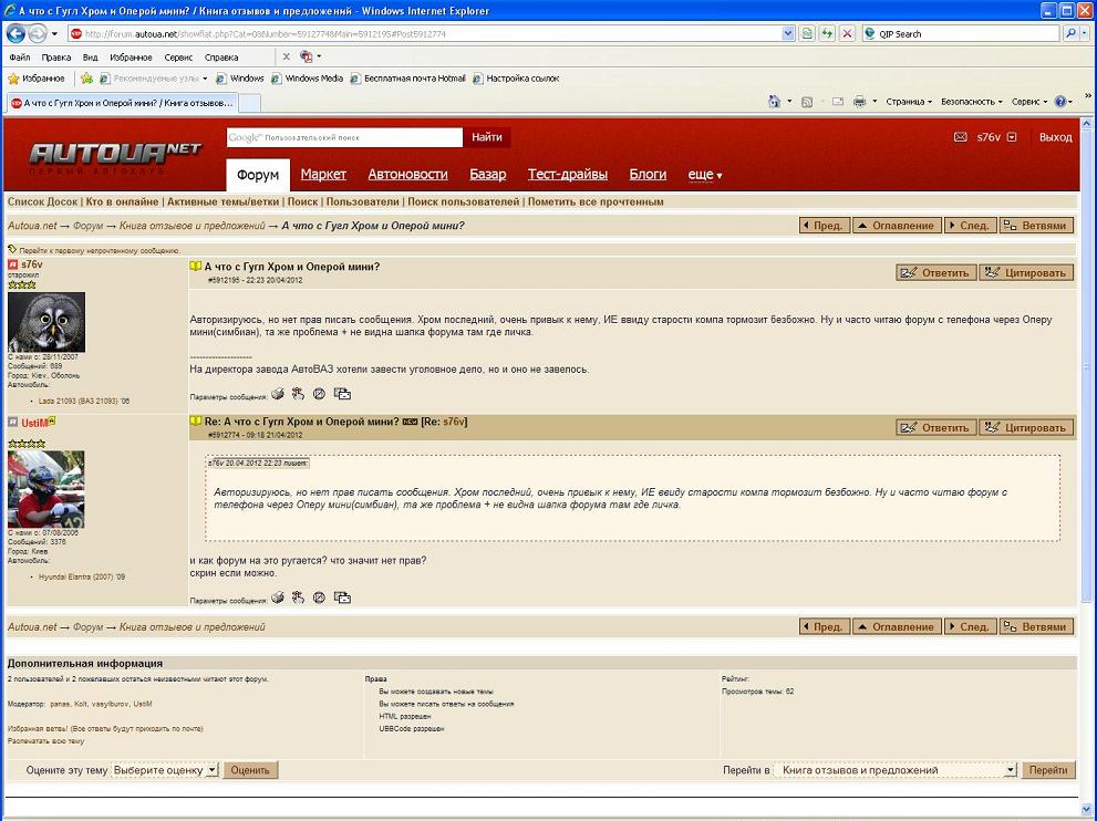 Авторизируюсь, но нет прав писать сообщения. Хром последний, очень привык к нему, ИЕ ввиду старости компа тормозит безбожно. Ну и часто читаю форум с телефона через Оперу мини(симбиан), та же проблема + не видна шапка форума там где личка.