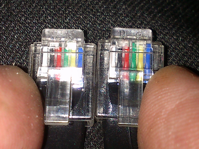 Петя, смотри. Берёшь р-м к себе контактиками и провод ютп. складываешь проводки типа так "синий,белосиний,зелёный, белозелёный,рыжий, белорыжий" . Так же должно быть и на второй стороне Тобишь, если ты каждому цвету присвоишь свой номер то р-м и один и второй должны выглядеть так: 1,2,3,4,5,6=1,2,3,4,5,6