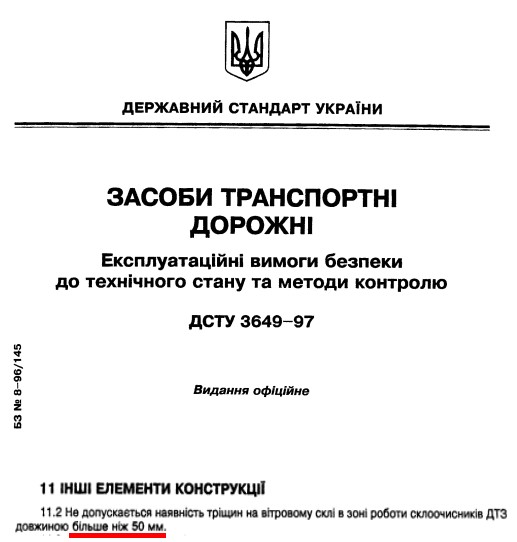 Ну это всё шелуха, которая тебе и нафиг не надо. Тебе надо одно - в КУоАП осутствует такое админ.взыскание, как штраф за трещину на ветровом стекле. И точно также - ПДД не запрещена эксплуатация ТС с таким несоответствием ДСТУ. Т.е. ни простой гаец, ни тех.инспектор НЕ МОГУТ наложить штраф или запретить эксплуатацию. Всё.
