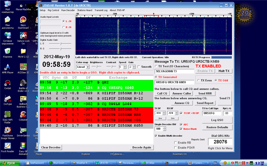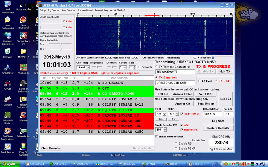 Андрей (UR5XFQ) Неплохо принимал тебя в субботу в JT65 на 10-ке, но антенна была "хвостом" на тебя Позвал пару раз, думал что отвтетишь, но получилось вот так: