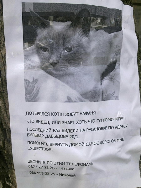 Сфотографировал объявление на Русановке. Жалко кота и хозяев, но на месте владельца второго телефонного номера на "самое дорогое существо" я бы обиделся