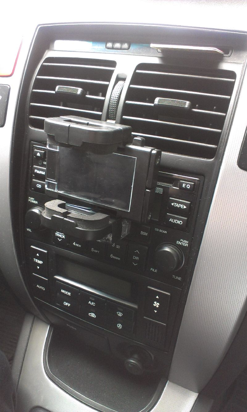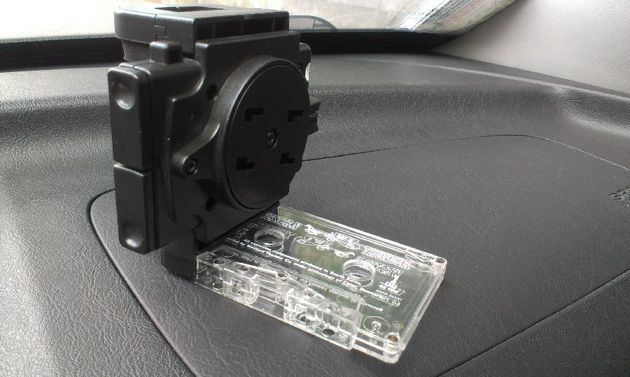 Надоели присоски на лобовом стекле? Отрываются,закрывают обзор? Недавно придумал мегаприблуду-"кассетный держатель" смартфонов,навигаторов и прочих приборов. Идея лежала на поверхности,но раньше в голову как-то не приходила. Суть такова: если в магнитоле есть слот для аудио кассет,то его можно использовать для крепления навигатора. В Туксоне работает "на ура"-держится надёжно,обзор не перекрывает,розетка прикуривателя рядом. Кассета разбирается,вынимаются все внутренности, потом склеиваются корпус кассеты и корпус держателя навигатороа,можно на клей Момент, я использовал двухсторонний скотч и чёрную изоленту сверху. Получилось неплохо. Всем желающим советую. Фотки ниже.