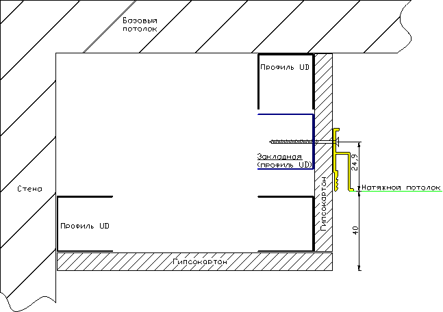 Для натяжного потолка гипсокартонная конструкция отличается только тем, что надо по всему периметру заложить профиль под крепление натяжного потолка. У себя так и сделал, осталось бортик доделать, т.к. у меня с подсветкой еще будет)
