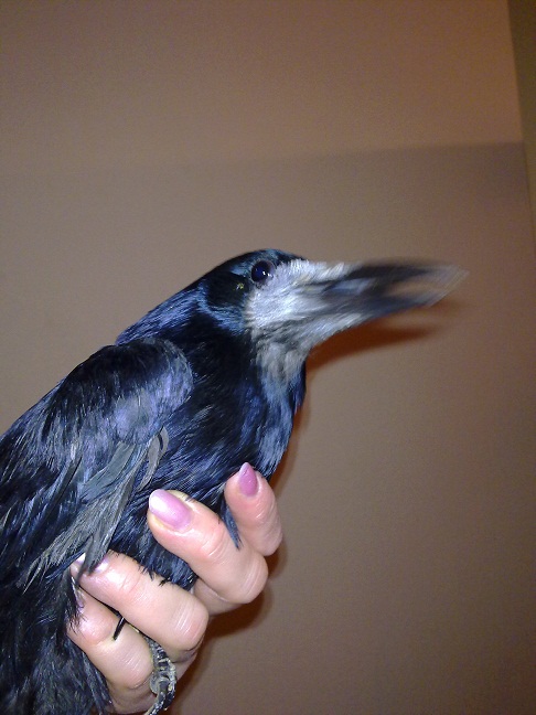 Это черная ворона. Клюется больно, но когда с ней ласково говорить, то просто держит палец в клюве. Она умная, а характер уже не изменить)))