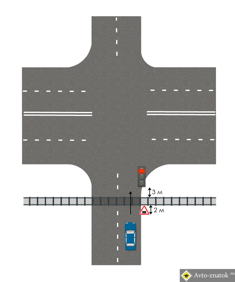 Где, согласно ПДР, должен остановиться автомобиль, если на ЖД светофоре разрешающий сигнал, а на автомобильном красный?