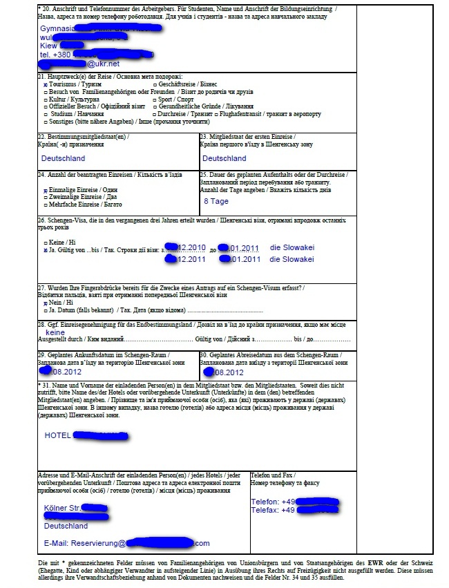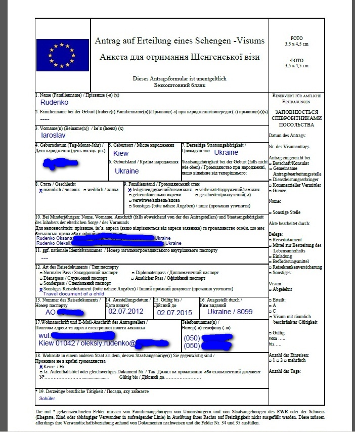 Дано: Ребёнок в возрасте до 14 лет со своим "проездным документом ребёнка". Анкету нужно заполнять как бы от его имени, подписывается родитель. У кого есть опыт? Гляньте, правильно ли я всё написал? стр.1 Основные сомнения касаются следующего: П.10: не нужно ли мне где-нибудь здесь указать данные своего заграна в связи с тем, что я еду с ним (или он со мной)? Кстати, насчёт указания двух родителей - вычитал на сайте Бундесконсульства для России. П.11: нету у киндера общегражданского паспорта. Прочерки, паспорт родителя, свид.о рождении? П.19: должность "школьник" нормально звучит?