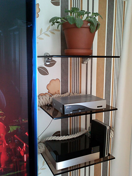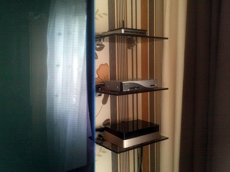 Полочки под аппаратуру там такие (сам делал, поскольку не нашел ничего в нужном размере). Вроде бы как металл + стекло. Но с другой стороны все остальное в комнате у меня "типа из дерева" и "внатуре из дерева".