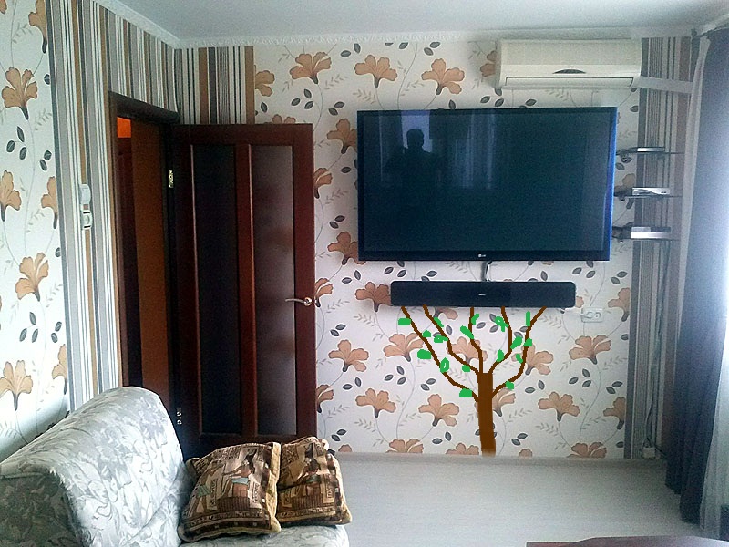 короб товстий "під дерево" - буде власне дерево. не до самого саунд-бару, а нижче, провода із нього не пуском пустити, а як гілки, обклеїти їх також під дерево листочків насадити на гілки - по бажанню