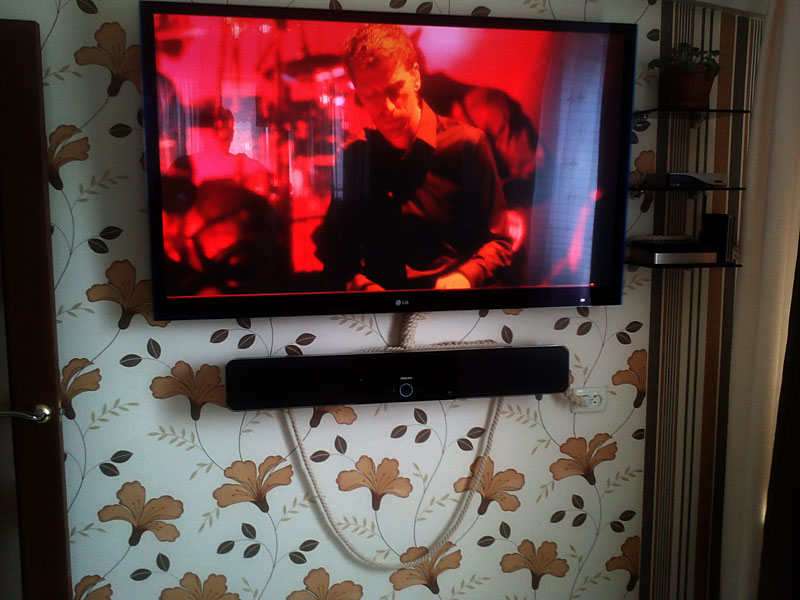 Тоже думаю над аналогичным вопросом. Провода от 5.1 в стены спрятаны, а вот тумбочку взяли ниже, нежели предполагалось. Временный вариант:
