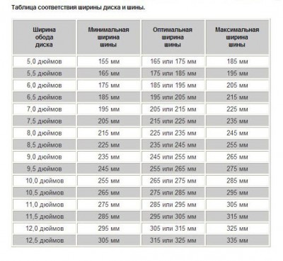 Есть формула для опрееления размера шин на диск: ширина шины/25.4-25%=вылет диска (допуск 1 дюйм) Т.е: 205/25.4-25%=6 215/25.4-25%=6.5
