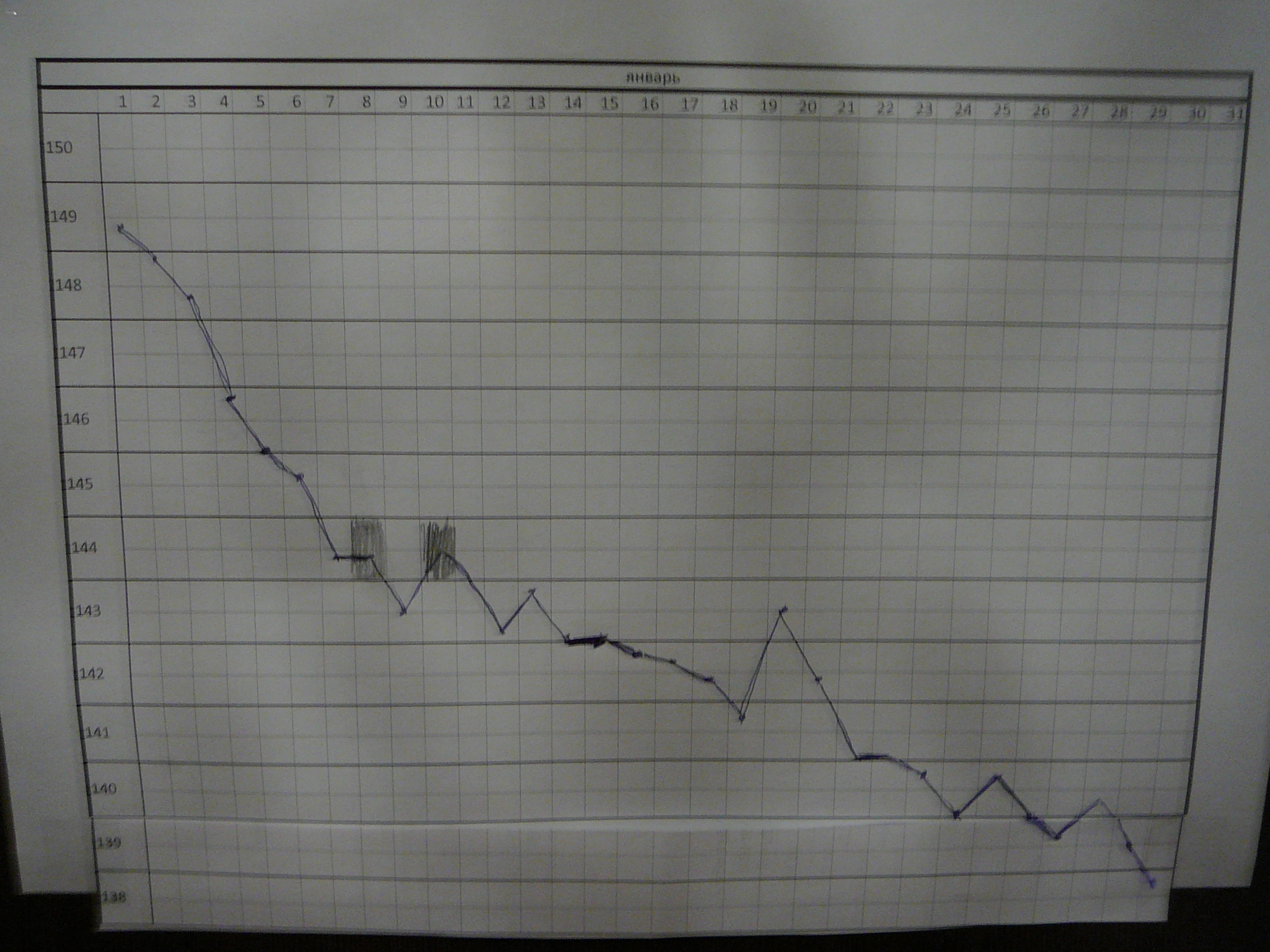 а шонипанятна? По вертикали-вес, по горизонтали- даты. Январь месяц. График висит на холодильнике. 1е января- 149,4.Пъянству бой. 31е января-138,5. Продолжение следует.