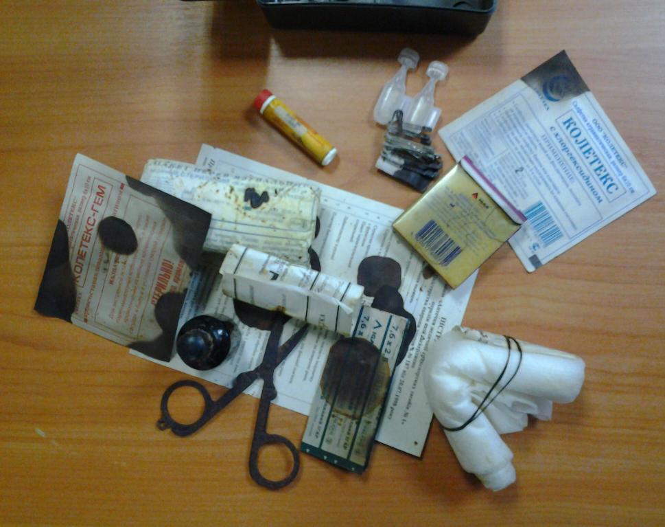 ЗЫ. Пятна на бумажках - это из флакончика йода вытекло. Меня ничего не удивило, кроме ножниц... С затонувших кораблей античных, наверное, такое поднимают.