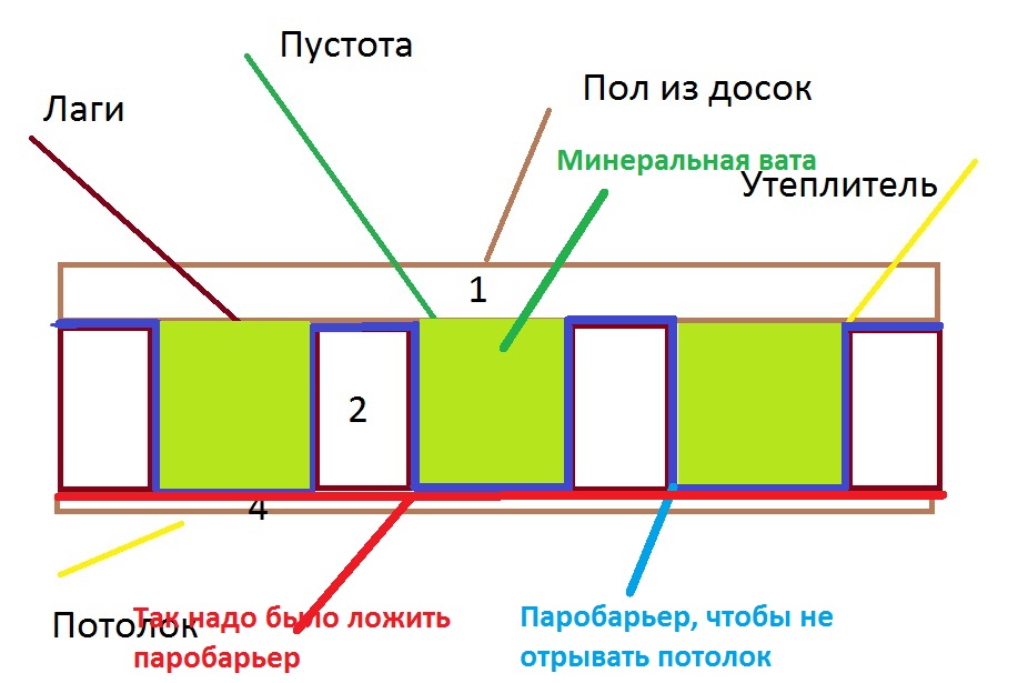 Спасибо за развернутый ответ, НО в моем случае, потолок не зафиксирован жестко к лагам это раз (т.е. класть прямо на него вату я боюсь, чтобы не обвалился), а во вторых, на лагах, как я уже писАл выше, лежат доски высотой почти в 60 мм, которые намертво приколочены к лагам 150-ками гвоздями... Если их снимать, я просто разрушу весь потолок напрочь. Поэтому и было принято решение утеплять поверх пола, а не между потолком и полом.