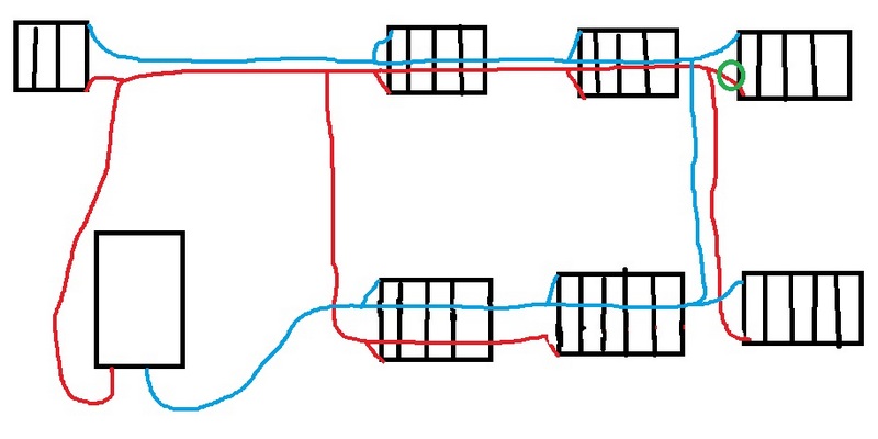 Частный дом, автономное отопление, алюминиевые радиаторы, двухтрубная проводка, горячая труба подходит снизу. Так вроди бы и ничего, только в последней комнате иногда скапливается воздух в кружке на рисунке и батарея не греет. Приходится перекрывать подачу во всех батареях, чтоб воздух продавить. Тут как раз ремонт подоспел, подумал я переделать немного отопление. Во-первых сделать диагональное подключение (а то батарея на 12 секций, последние почти не прогреваются), во-вторых горячей воды подачу вывести вверх. Таким образом и воздух, блуждающий системе будет скапливаться в батарее, откуда будет удаляться через кран Маевского. А то при теперешней системе воздух, попадающий в батарею, тут же засасывается в обратку. Какие будут мысли? Хуже от этого не будет?