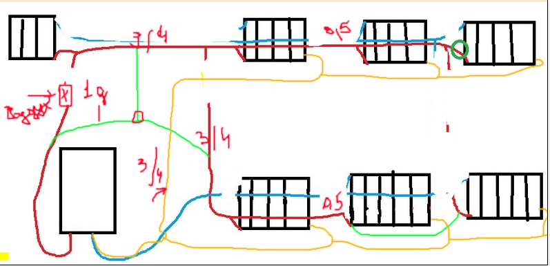 Я сам делал отопление.Разводка нижняя,все отлично прогревается и работает.Стоит 8 батарей по 10-15 секций,бойлер и теплые полы. 2 насоса-один на обратке возле котла и второй на полы.На 1 делении все нормально продавливает.В морозы максимум на 2 ставлю.Разводка сделана -до разветления дюймовая труба,от разветления(их 3) до 1 батареи в ветке 3/4,дальше 0,5.Обратка вся 3/4.Стоят термокомпенсаторы труб.Быстро,нормально прогревается,с воздухом вообще нет проблем.Что то у тебя с разводкой не то,скорее всего.А подключение батареи большой роли не играет.На разный диаметр труб мне спецы,как на важный момент,делали упор.Я как мог твой рисунок изменил.Где то так у меня стоит.И еще,у меня стоят воздухоуловители на подаче.Никак воздух в системе бегать не может.Может,легче их поставить.Если надо,могу разводку возле котла сфотать.