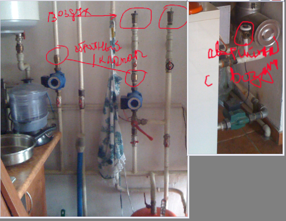 Трубы тонкие для отопления.Обычно делается ступенчатая подача,особенно при таком разбросе батарей,как у тебя.Воздухоуловитель-в Эпике около 80грв цена,бадейка с золотником.На фото,у меня стоит 2-один на полы,второй на батареи.Золотник как в авто в колесах.На даче поставил гребенку в самой высокой точке,туда манометр,термометр,воздушник,аварийный.И нормально,все на виду.Сделай и себе так,и проблем меньше будет.