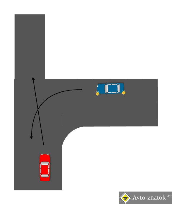 если смотреть широко, то таки красный ехает себе, не меняя ничего в своей жизни, а синий собираеца совершить маневр, да еще и поворотом налево именуемый