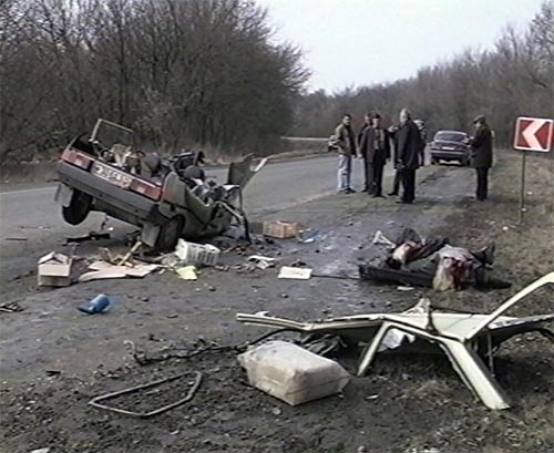 Ты видимо говоришь о том что "в результате лобового столкновения "Таврия" перевернулась и упала в кювет" хоть на фото она стоит на обочине?