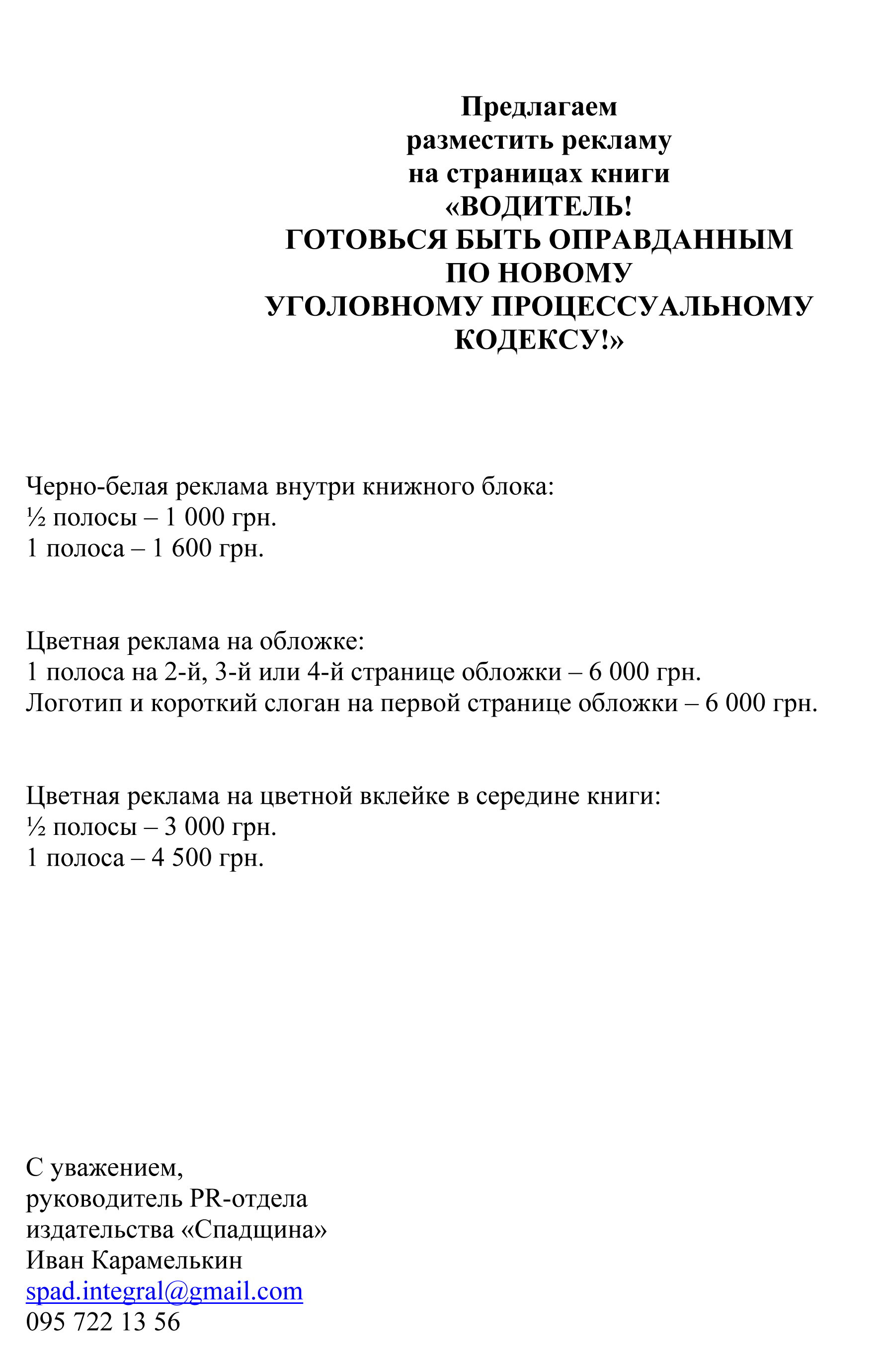 Скоро выходит моя новая книга. Тематика - защита водителей по новому УПК, который ступает в силу в ноябре. А книга, предполагаем с издательством, будет в продаже в октябре. Интересует (прежде всего издательство) возможности распространения через сети заправок, автомагазинов и прочие подобные места, где бывает много водителей, и где торгуют разными товарами, в том числе и такими. Также офисы страховых компаний, возможно, и пр. Кто работает в таких компаниях, может, есть заинтересованность? Аналогов этой книги на рынке нет. Также, если кого-то интересует, издательство рассмотрит размещение рекламы в книге. особенно смежные отрасли (страхование, судебная экспертиза, перевозки, автобизнес, кроме конкурентов ), - издательство такую возможность рассматривает.