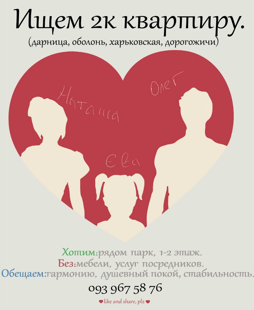 Нас трое: я(26л), жена(26л), дочка (5 мес). Что хотим: рядом парк,1-3 этаж, желательно метро. Что не надо: мебель(есть вся своя, кроме кухни), услуги посредника. Обещаем: гармонию, душевный покой, стабільність.